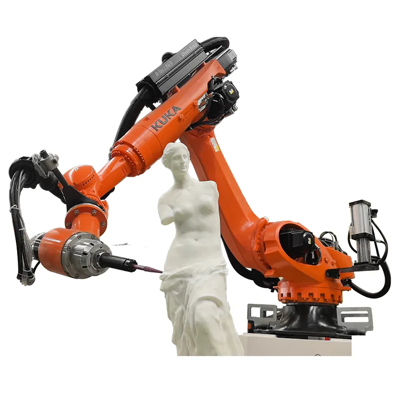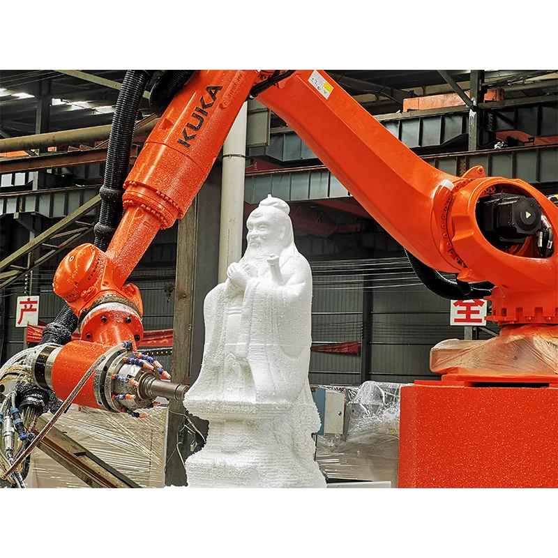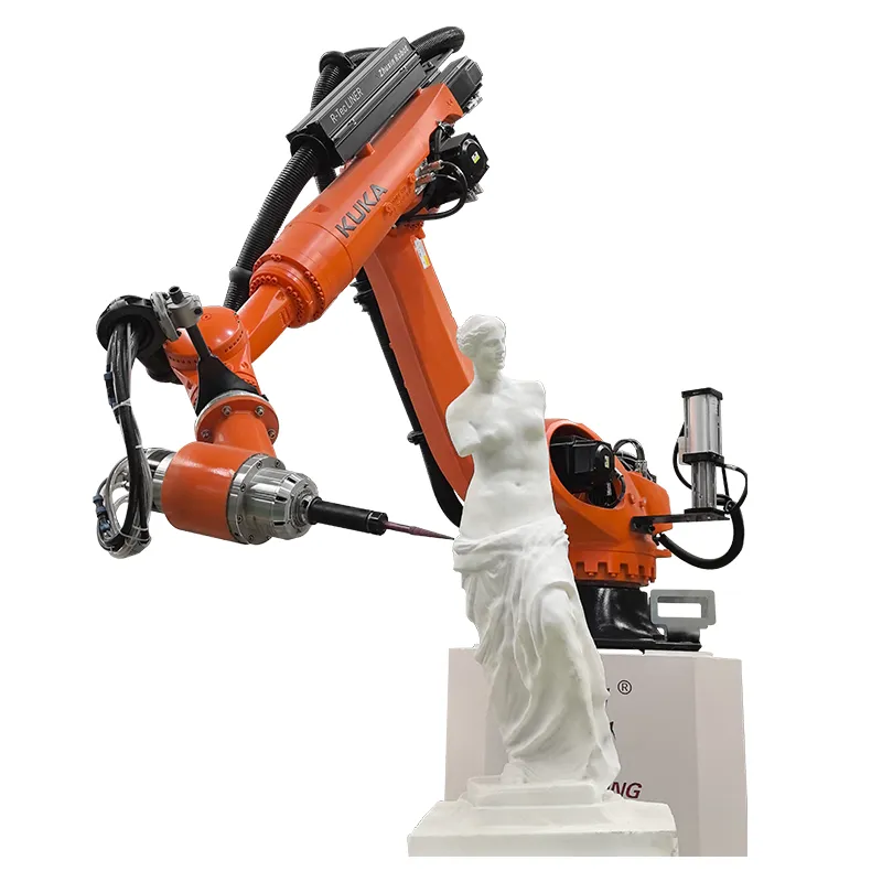 7-осевой робот KUKA HLRB-7A3D для интеграции автоматизации и вторичных продуктов разработки, предназначен для 3D-резьбы по камню, долговечен, высокоточен (высокоскоростная ось, встроенная в руку), универсален и прост в эксплуатации. Он использует автономную систему программирования Sprut CAM для выполнения сложной обработки заготовок. Конфигурацию можно изменять по желанию. Даже в суровых условиях робот может работать нормально, с сроком службы до 15 лет и средним безаварийным временем до 70 000 часов.